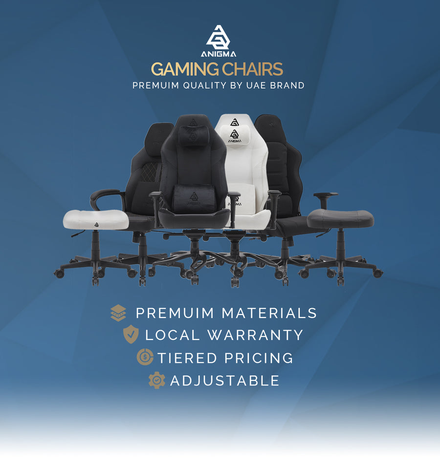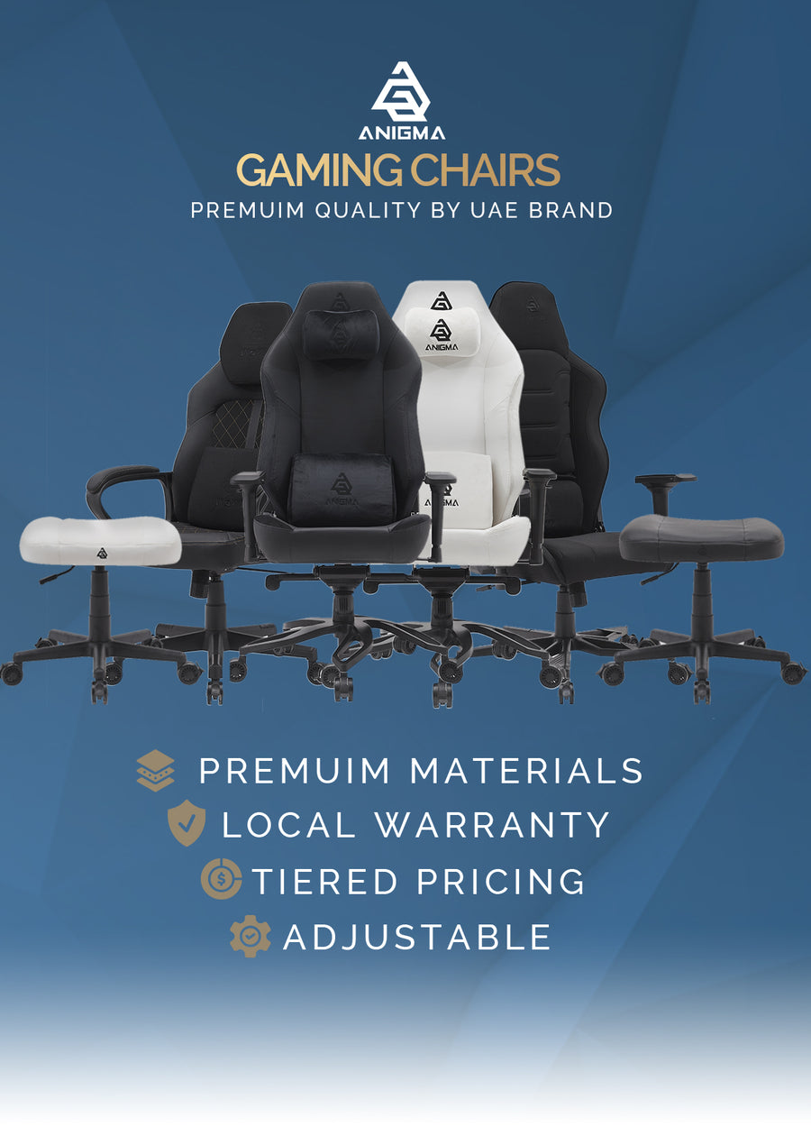 Starts from 549 AED to 1099 AED, Designed and Tested in UAE, Anigma Gaming Chairs have features like, 2-in-1 backrest, 4D armrests, Premium Gas Lift, Lumbar Support, Memory Foam Pillows, 1-year Warranty on the Mechanisms &